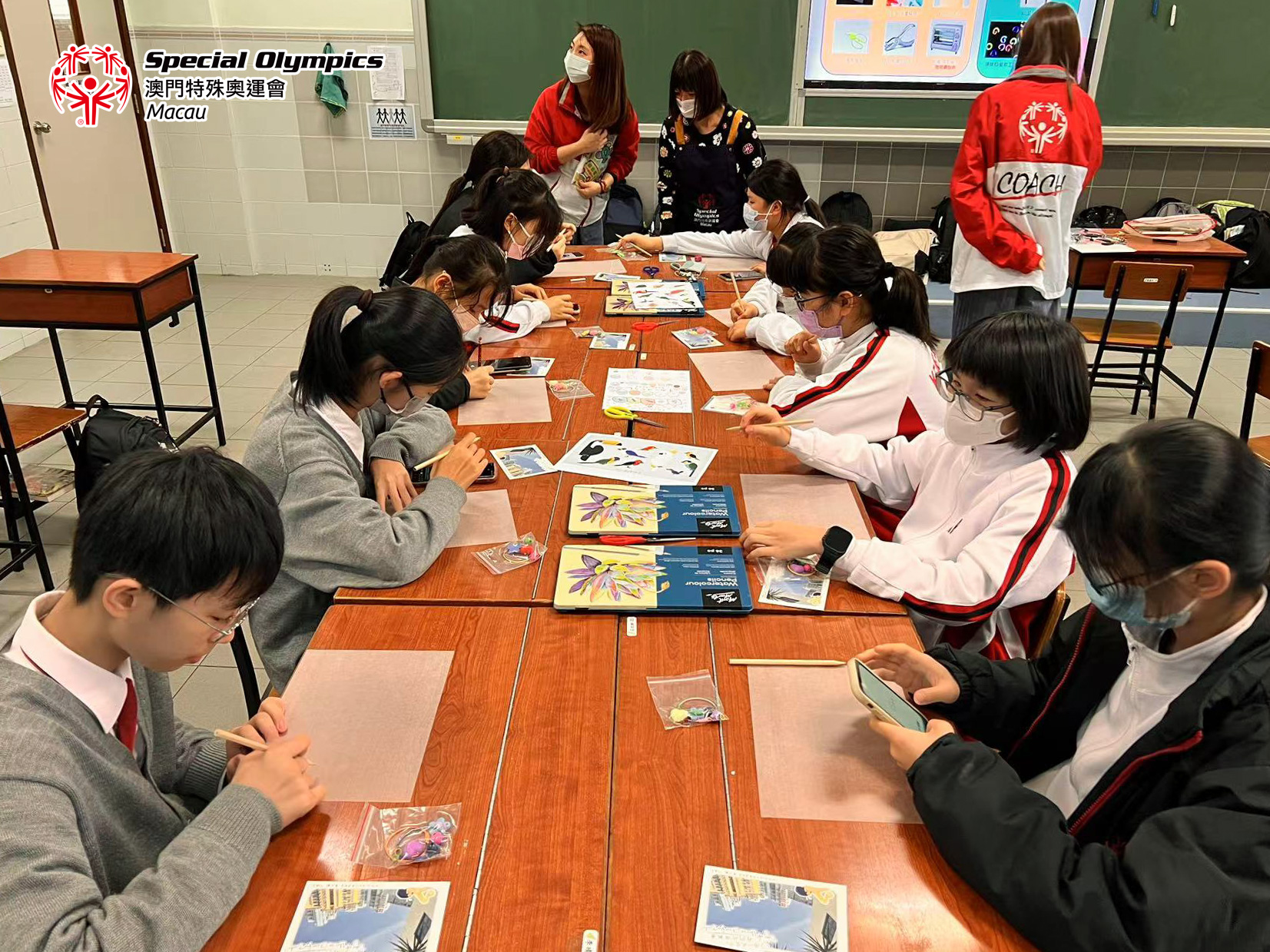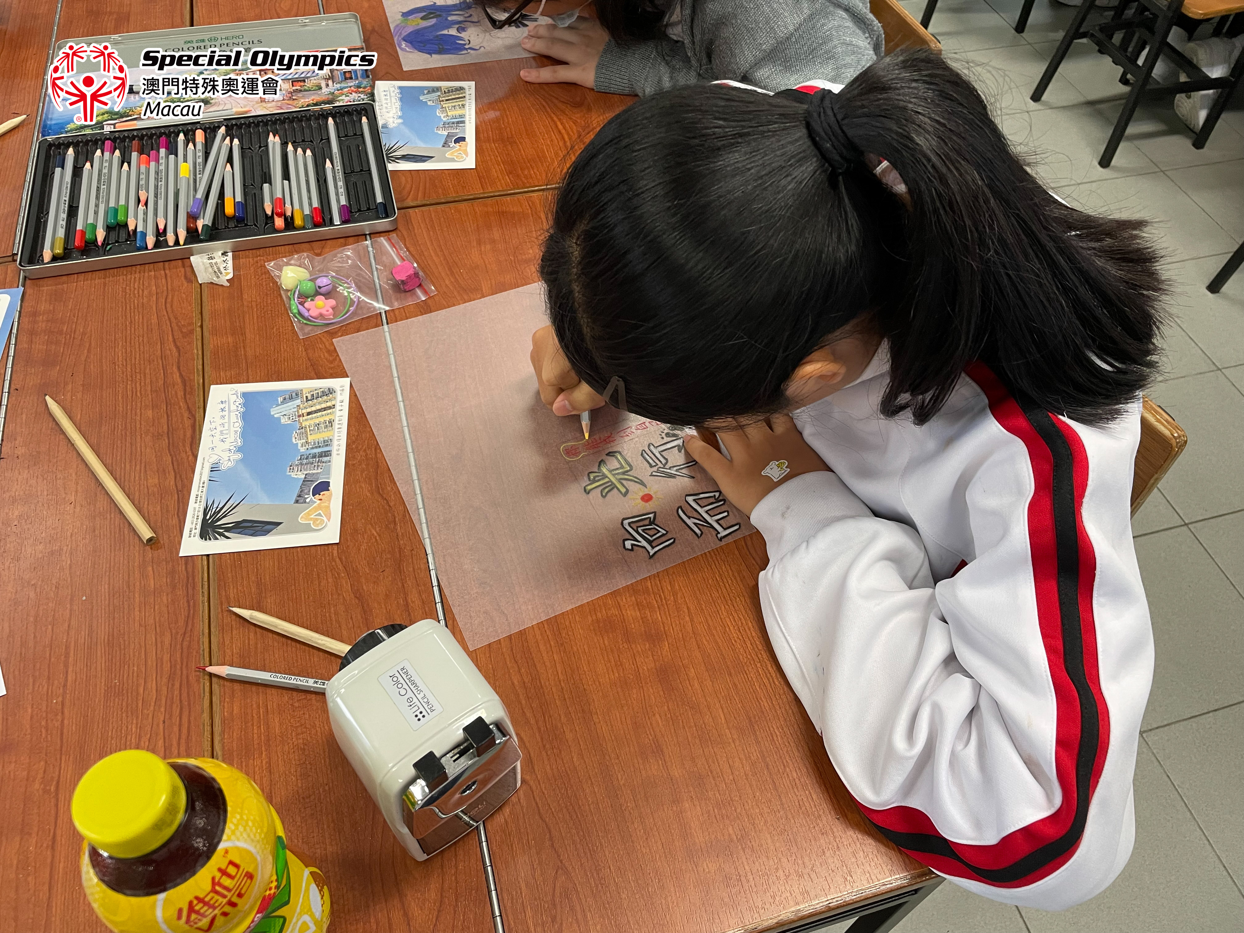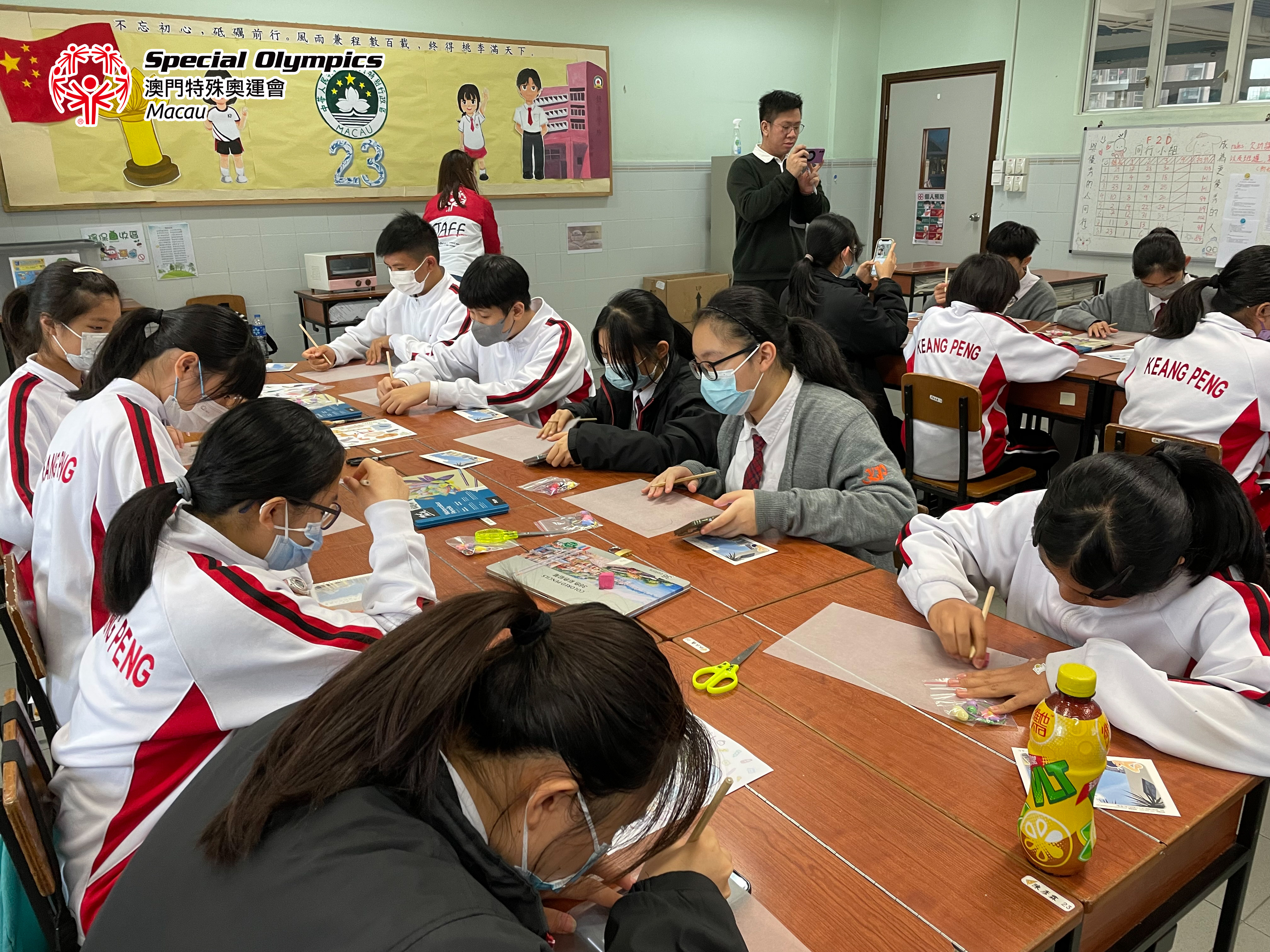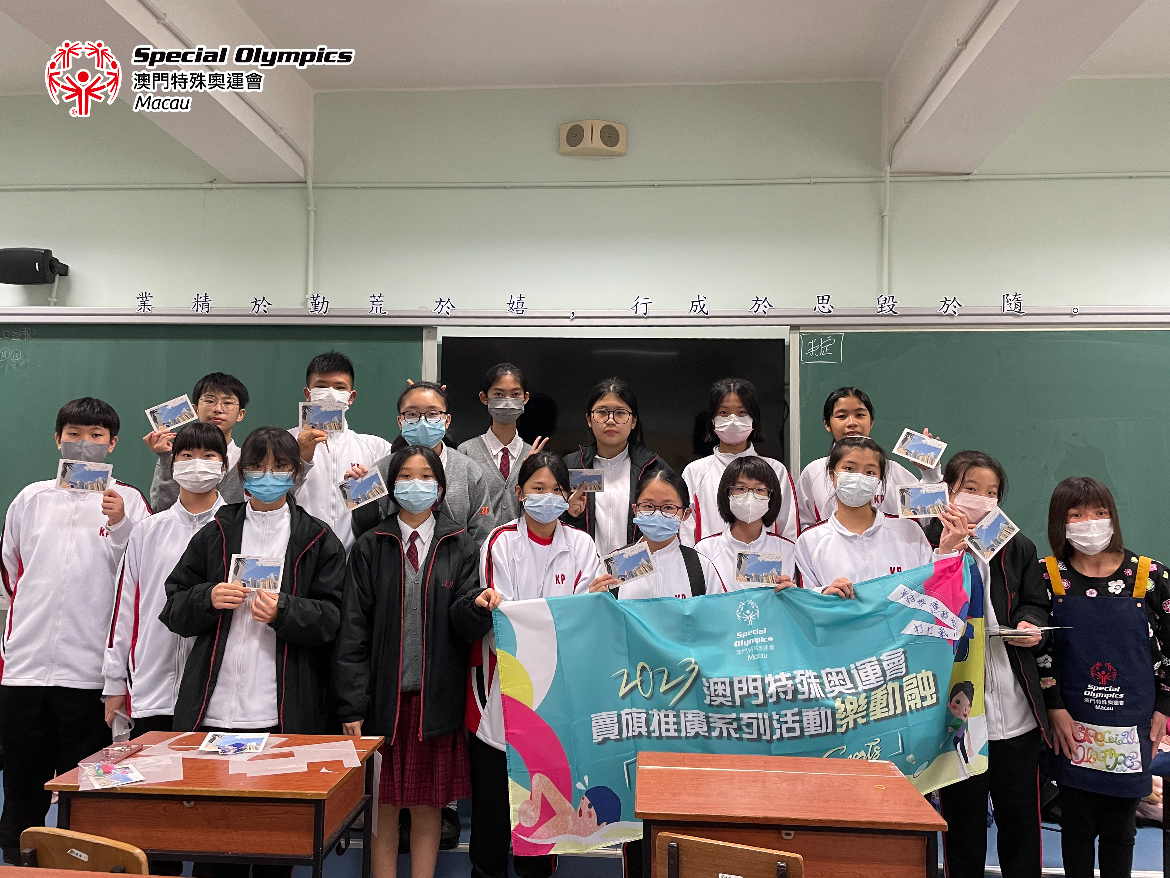工作坊期間有一位同學所製作的熱縮片為“向光而行”的字句,而今次帶入鏡平學校的明信片運動項目是游泳、滾球以及保齡球,相信三位運動員代表的天空也是陽光普照,在不同的賽事上堅持“向光而行”!期望能收集越來越多的天空明信片,更多本地青少年為運動員們寫下加油字句,將祝福由澳門帶往柏林!