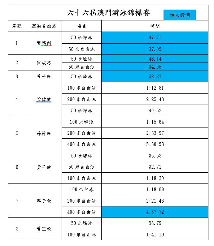 由 中國澳門游泳總會 主辦的「第六十六屆澳門游泳錦標賽(2023)」於日前在澳門奧林匹克體育中心-游泳館舉行,本會派出8名運動員角逐11項賽事,8名運動員均順利完成賽事。更有運動員打破自身個人最佳紀錄。