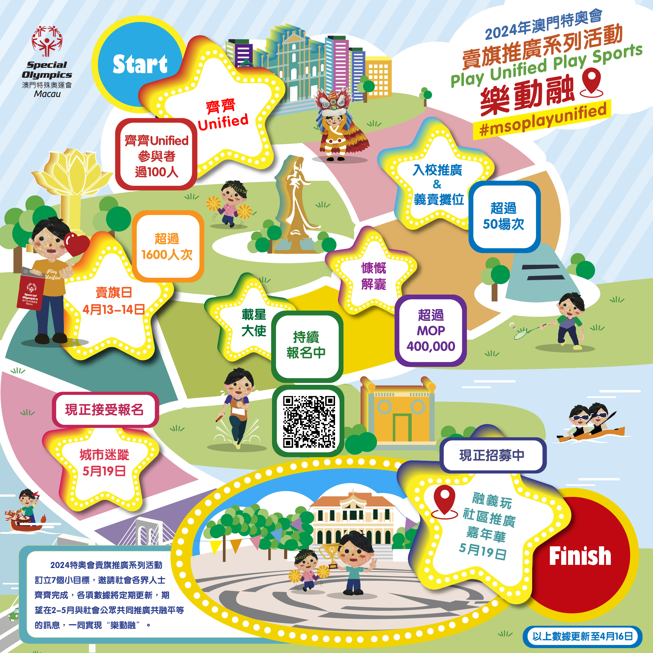 由澳門特殊奧運會主辦的「2024澳門特奧會賣旗推廣系列活動—Play Unified, Play Sports樂動融 」於二月至五月透過不同形式的活動於社區上推廣「共融和平」訊息。系列活動之一的特奧賣旗日已於4月13以及14日圓滿完行,於全澳各地區共籌得善款逾澳門元40萬用於特殊人士服務;而慈善捐款以及一系列的推廣活動亦仍在進行中。