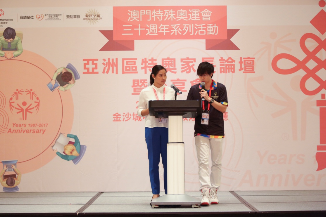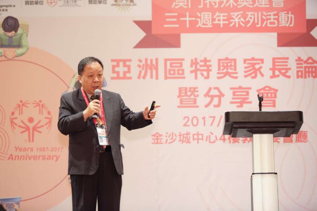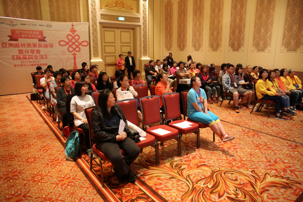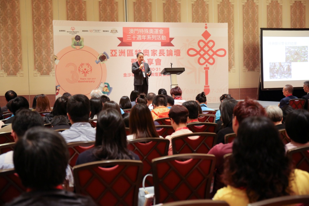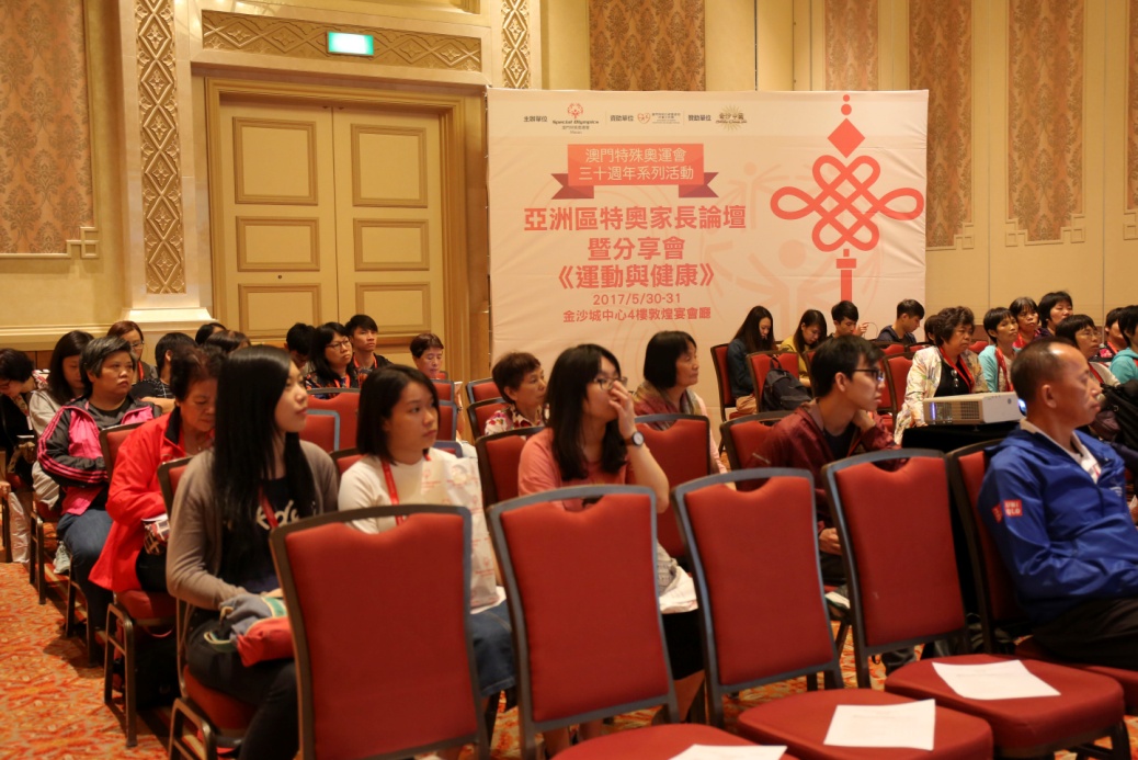 30週年系列“亞洲區特奧家長論壇暨分享會”於5月30日至6月1日假金沙城中心舉行,澳門的家長論壇暨分享會已連續舉辦了十年,今年籍著澳門特奧30週年機會,除來自兩岸四地及亞太區的智障人士家長及專家參與外,本會更邀請到來自亞太區特殊奧運會青年領袖Cherish Aperocho來分享經驗、策略,如何將特奧工作和聯合國《殘疾人士權利公約》結合推廣。今次議題『消除歧視達致社會共融』,當中還包括智障人士的融合教育、運動與健康、輔助就業形式及雙重老化等,更重要的是相關活動由澳門家長參與策劃工作。藉由此活動讓各地智障人士家長互相交流學習,並得到社會大眾更多的支持及鼓勵。