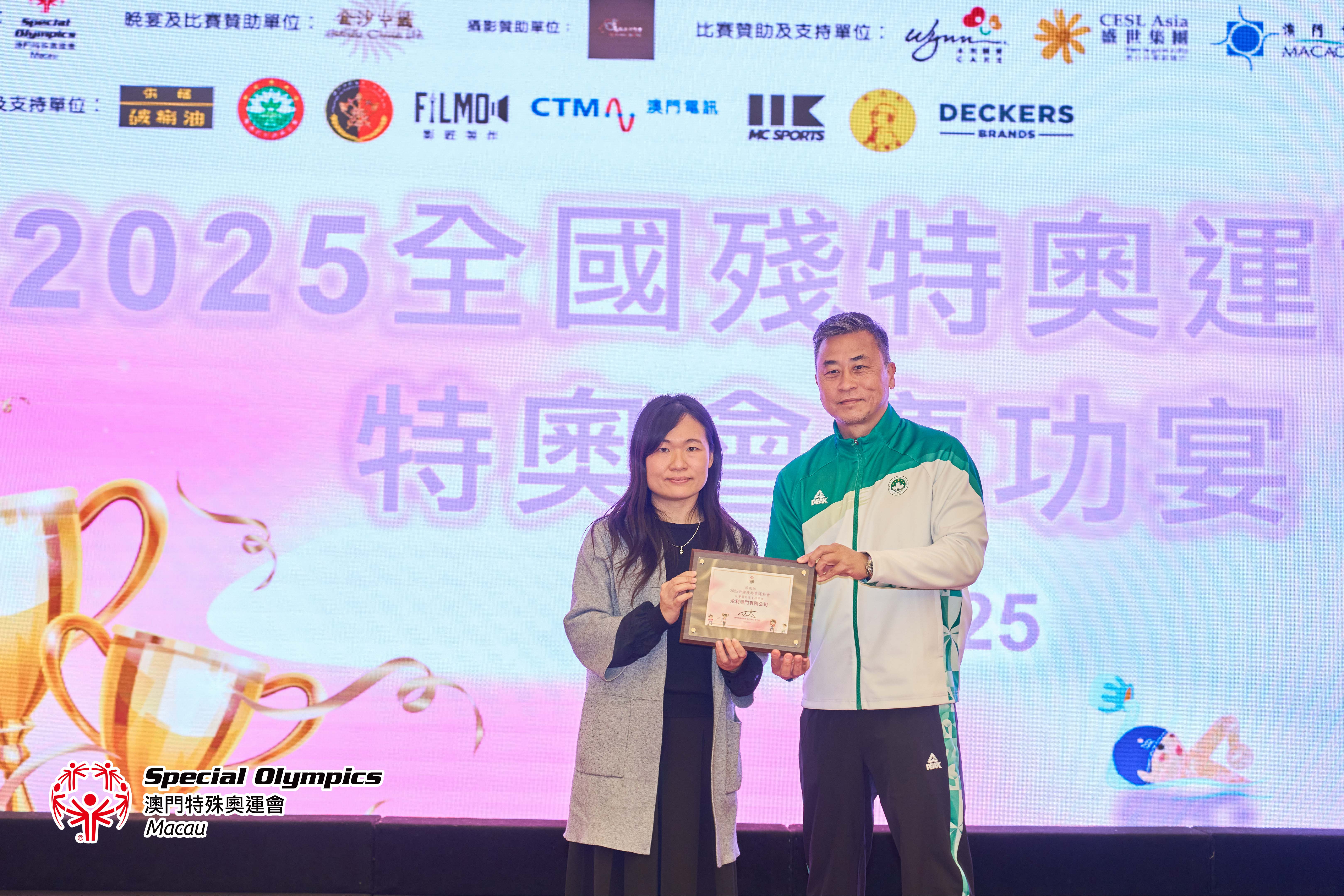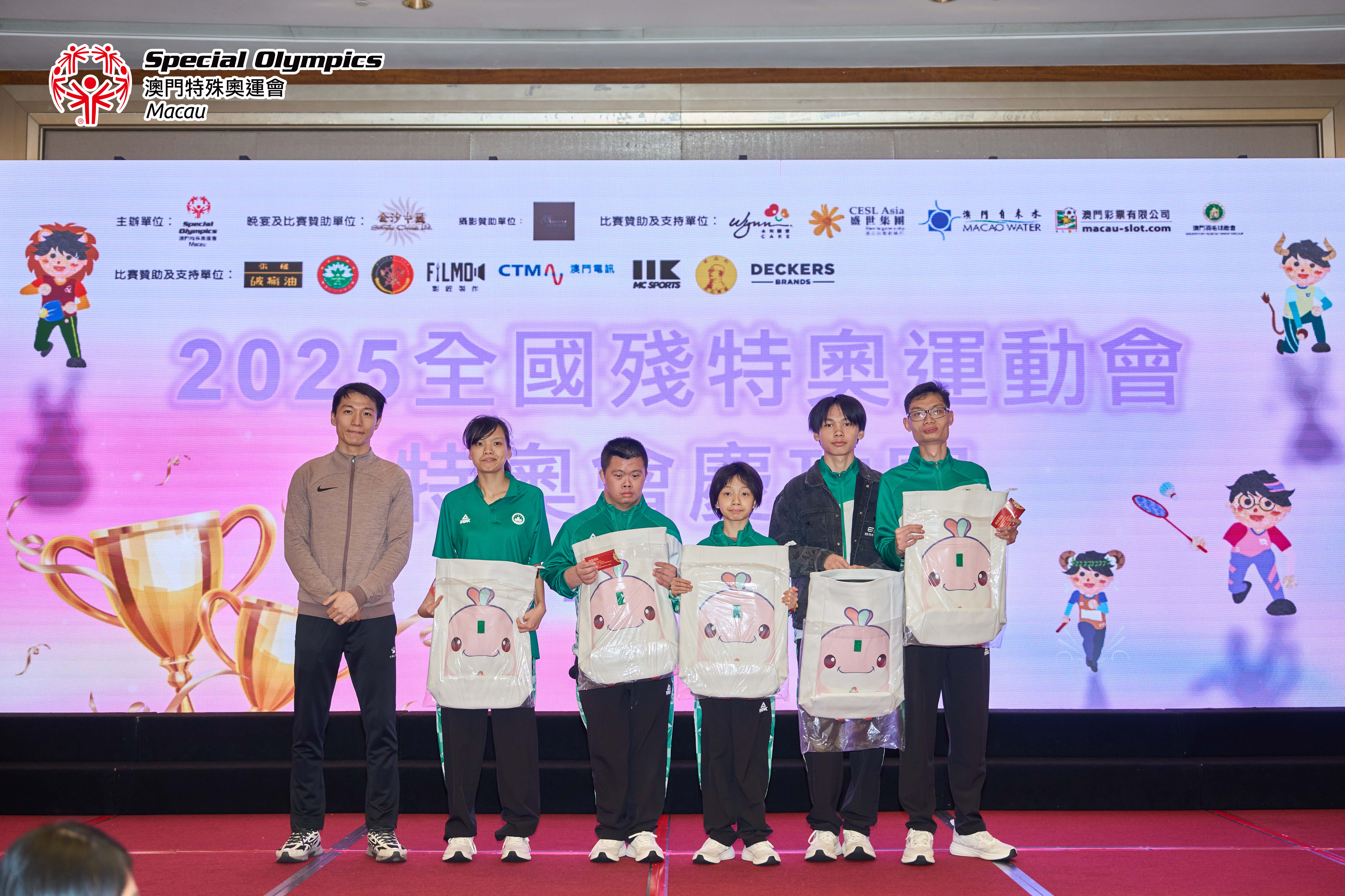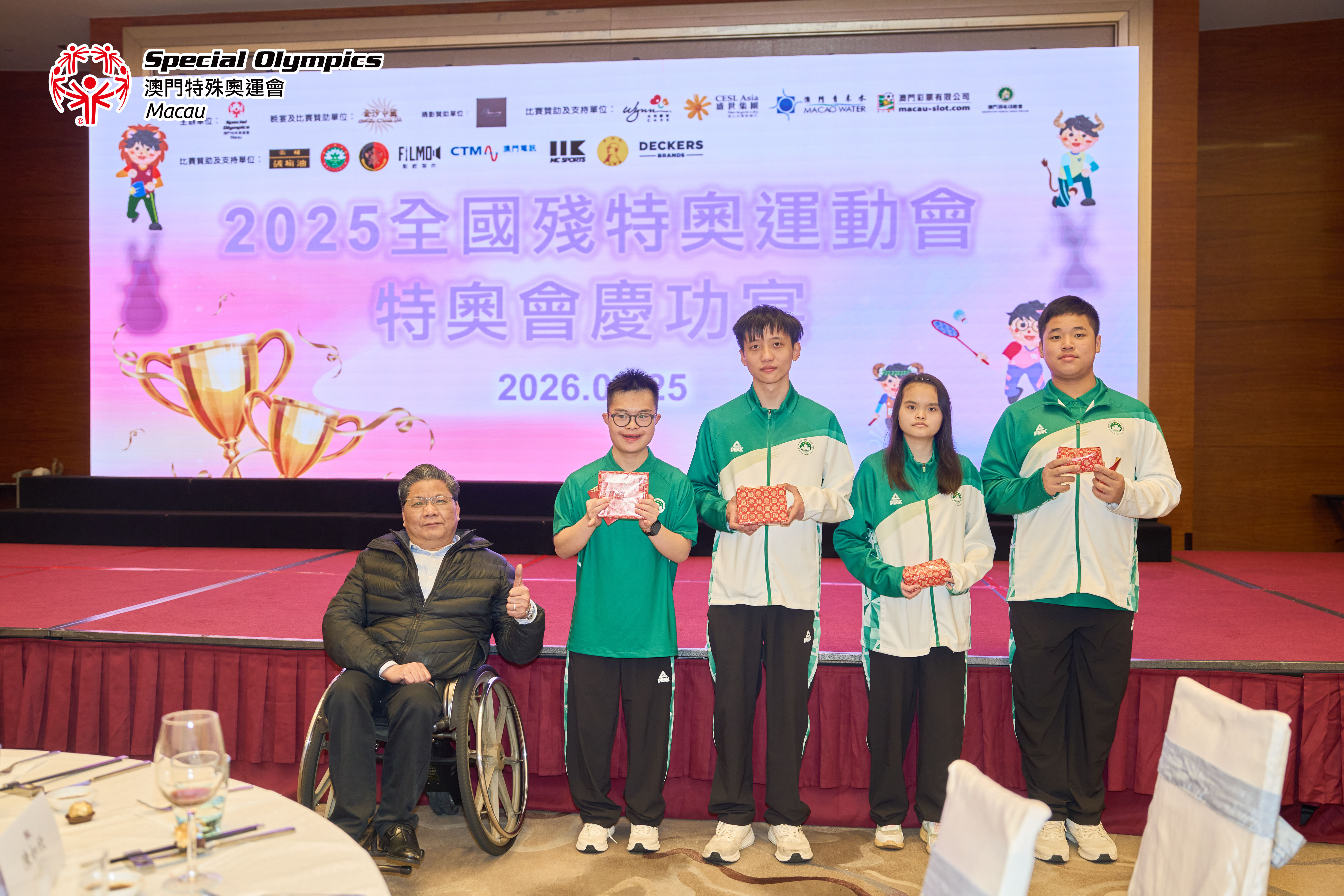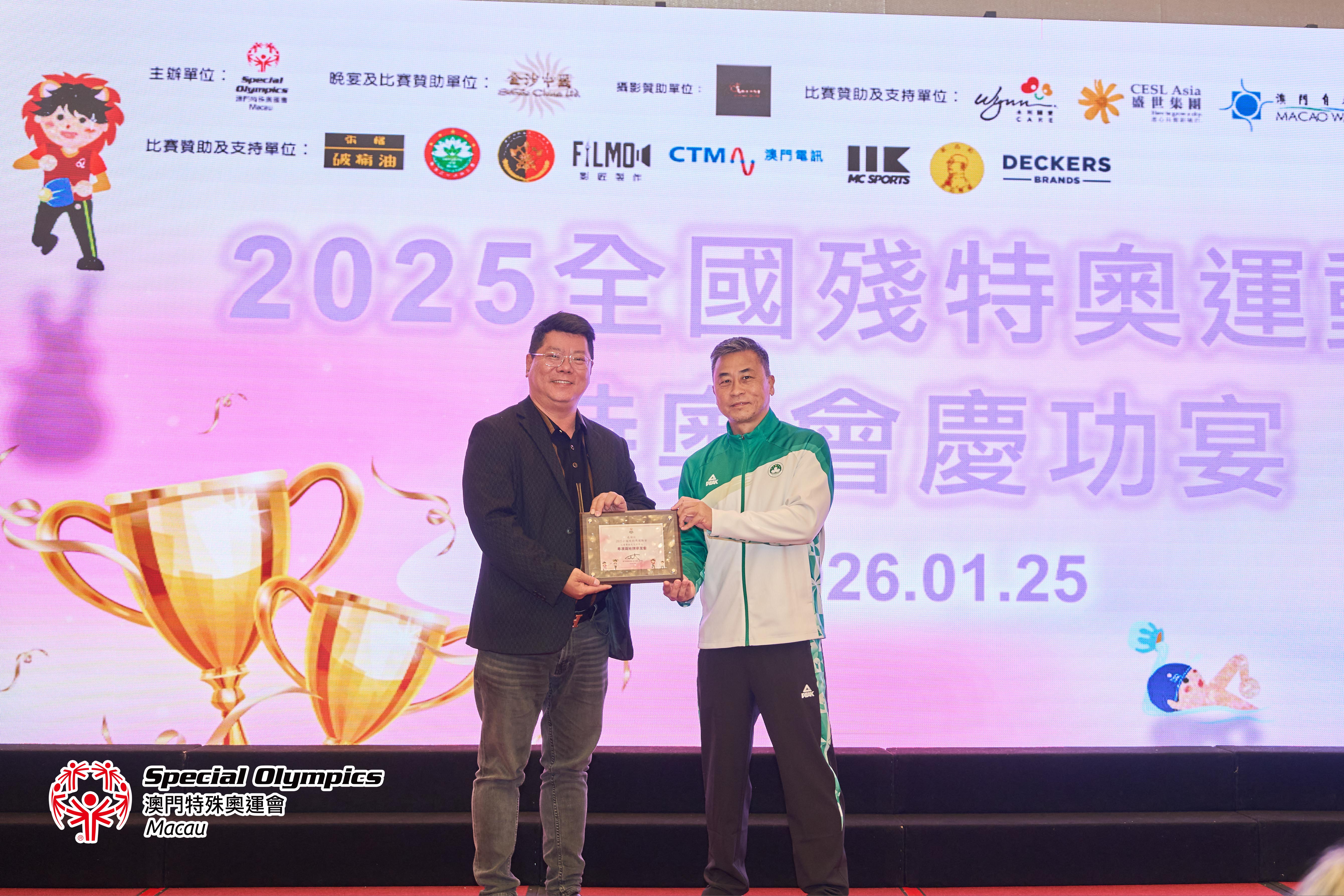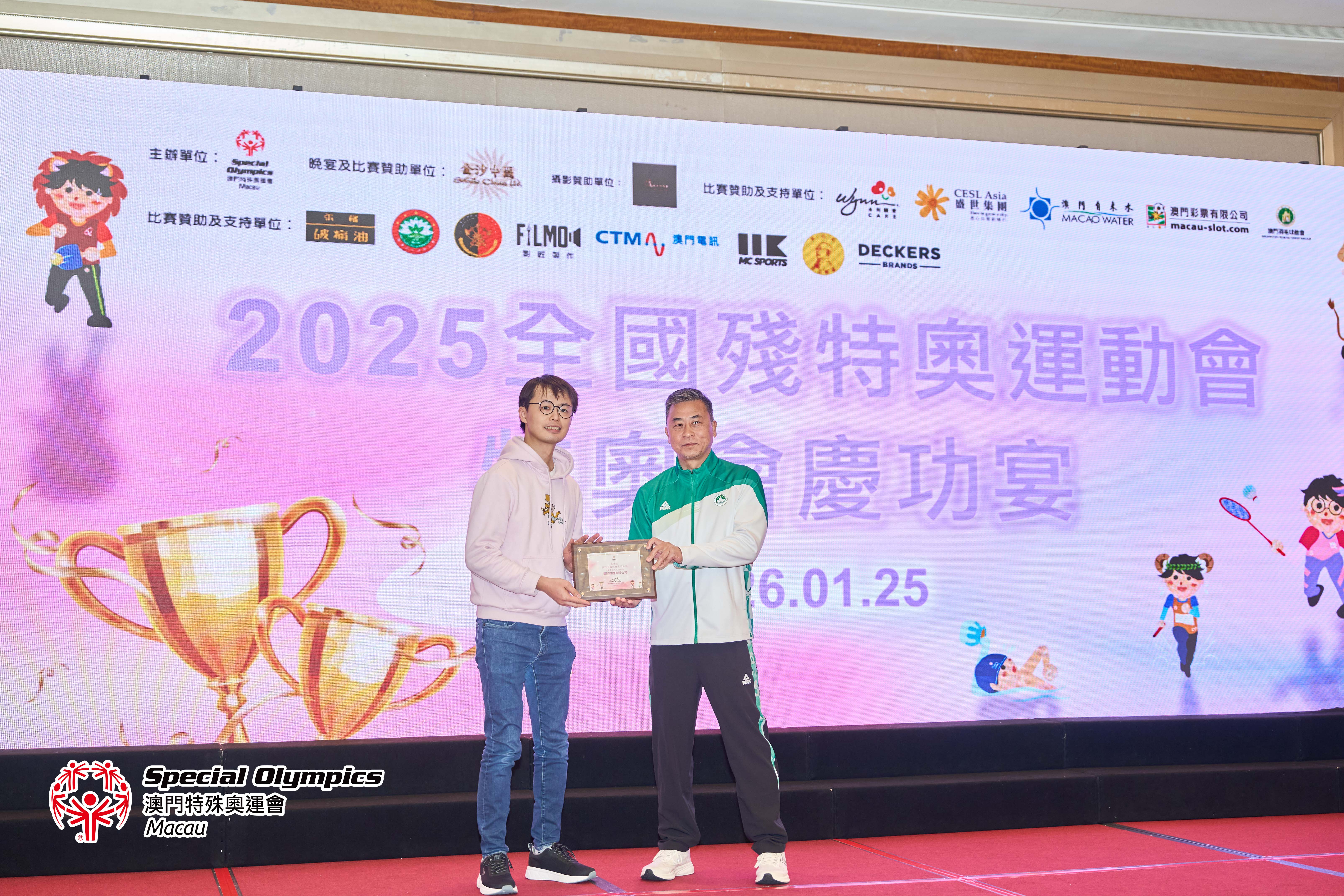 晚宴上,除了播放賽事精華回顧及進行抽獎環節外,亦頒發了七名由教練及工作人員評選之本屆全殘特奧運動會「最優秀運動員」獎項,以及嘉許四位因比賽成績優異而符合「精英及集訓隊運動員培訓資助計劃」申請資格的運動員。晚宴特別設置了「時間錦囊・願景共曉」環節,將此時的感動與祝願,化為未來推動共融的實際行動。最後,我們衷心感謝所有默默付出的義務教練、隨隊人員、後勤體育組同事以及始終陪伴在側的家長們。