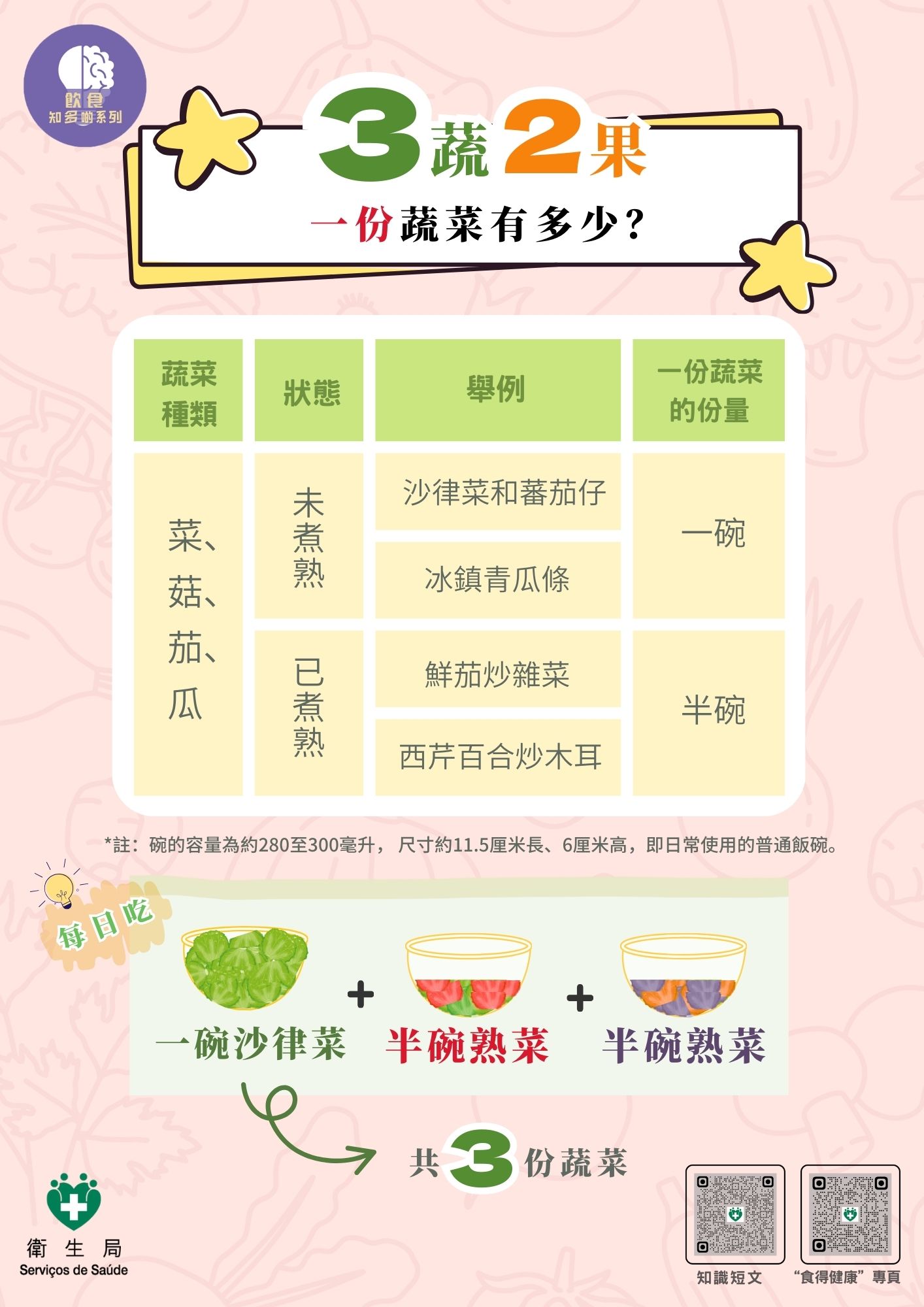 - 3 份蔬菜:每餐半碗熟菜
