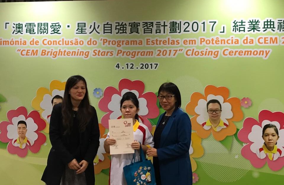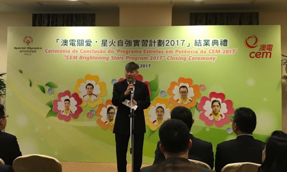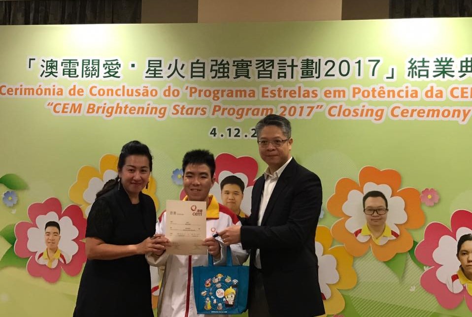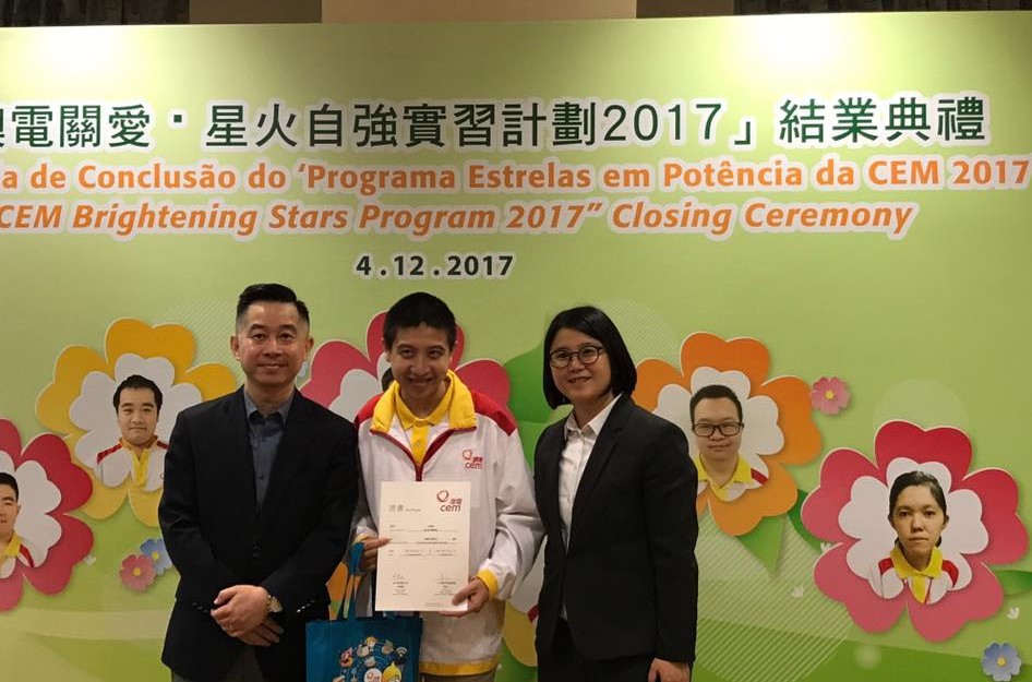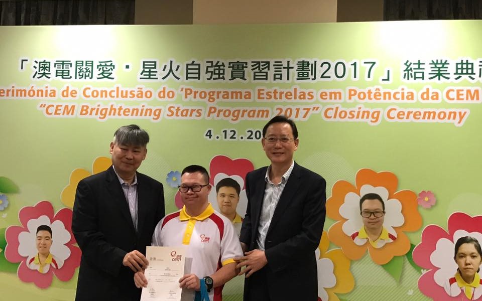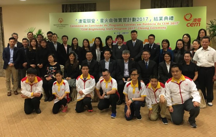 澳門電力股份有限公司與澳門特殊奧運會合辦的“澳電關愛 · 星火自強”實習計劃結業禮於12月4日舉行,七名實習生於澳電完成為期三個月的實習。由中聯辦社工部副處長孫志君、勞工事務局副局長陳元童、教青局教育心理輔導暨特殊教育中心代主任馮紫華、社工局代表高級技術員陸麗瑗、立法議員宋碧琪、電力客戶諮詢委員會委員、特奧會執行總監蕭宇康及特奧會秘書長羅凱敏等向實習生頒發結業證書。