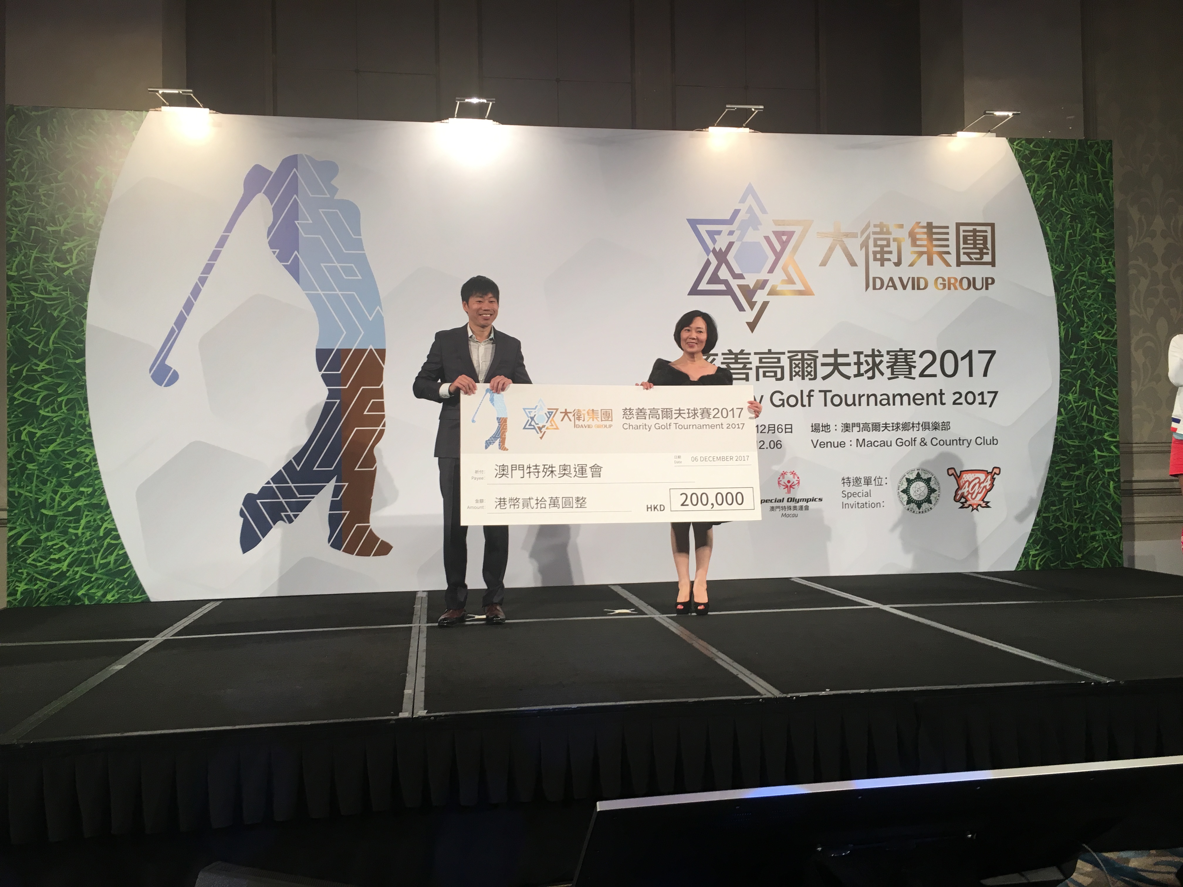 在傍晚的頒獎晚宴上,大衛集團副主席兼執行董事王瑞欣女士代表捐助澳門特殊奧運會20萬善款,用予支持智障人士服務,作為一間承擔澳門公益事業的公司,展現其企業社會責任,善款將作為智障人士提供體育及社會服務,使智障人士服務得以更好地發展,使更多的弱勢社群受惠。