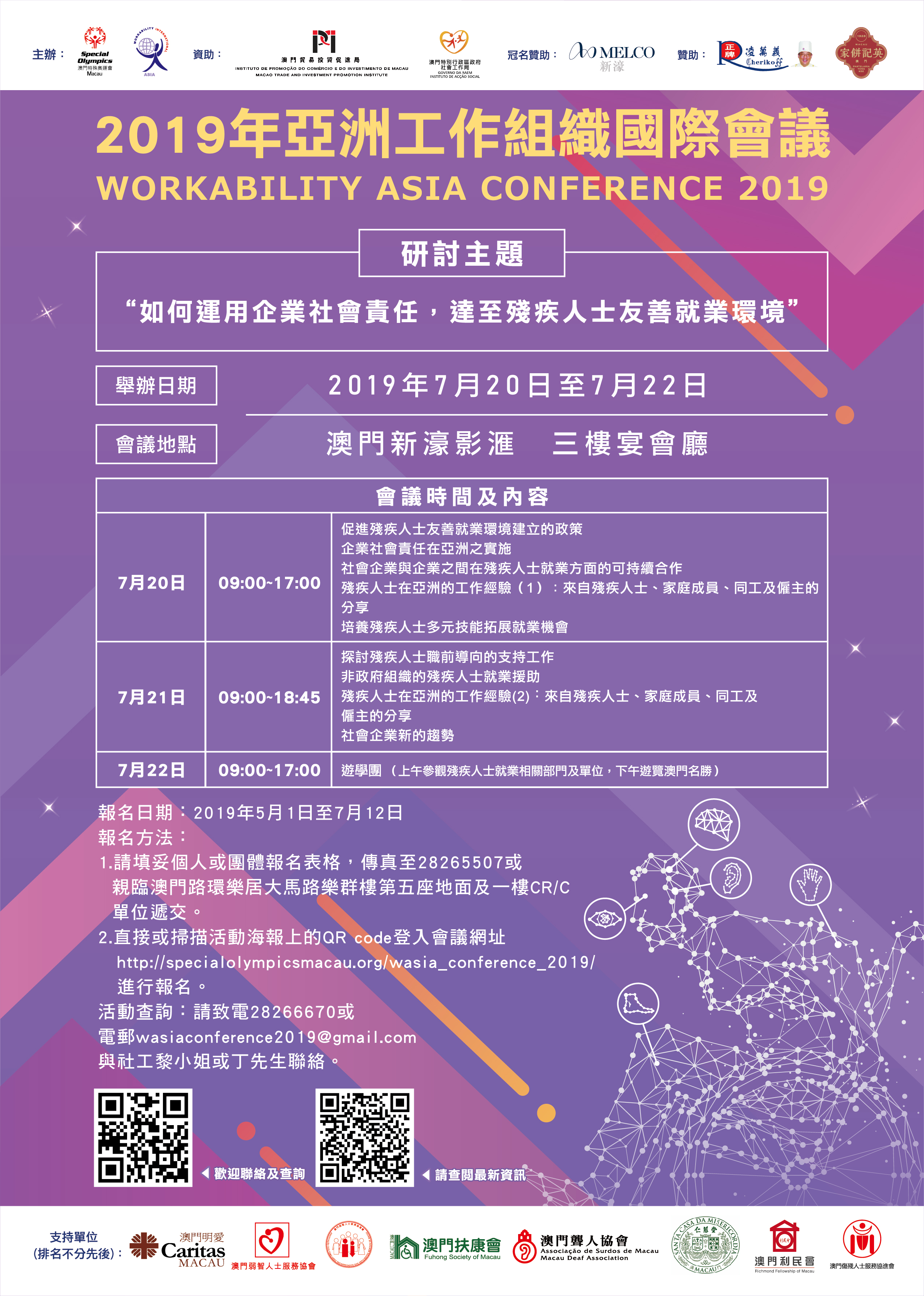 如欲參與或了解相關詳情,請瀏覽 http://specialolympicsmacau.org/wasia_conference_2019/ 或電郵至wasiaconference2019@gmail.com 與會議秘書處查詢。